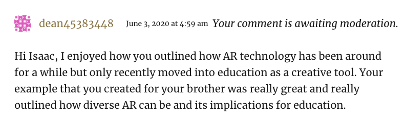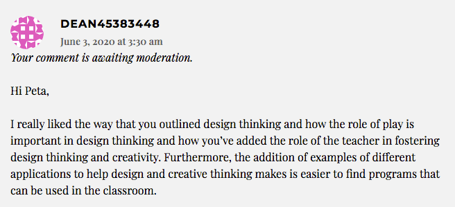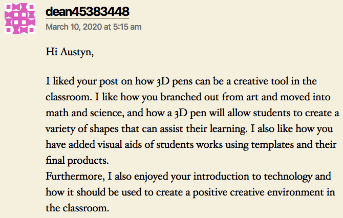 Community Engagement Comments on Peers Blogs Austyn’s Critique on 3D Pens Jack’s Critique on Sketches School https://educationtechnologycreativity.wordpress.com/2020/03/31/design-thinking-and-learning-by-design/comment-page-1/?unapproved=10&moderation-hash=09dda5b4efaf8a625e69052b255ee678#comment-10 https://georgiaerj.school.blog/2020/03/21/computational-thinking/comment-page-1/#comment-24 https://npoullos.wordpress.com/2020/04/14/robotics-beebot/comment-page-1/#comment-6 https://isaacsmith.school.blog/2020/04/10/week-6-augment-reality/comment-page-1/?unapproved=9&moderation-hash=efe25a0aa0140a78822bcf9d859edbdc#comment-9 Share this: Share on X (Opens in new window) X Share on Facebook (Opens in new window) Facebook Like Loading...